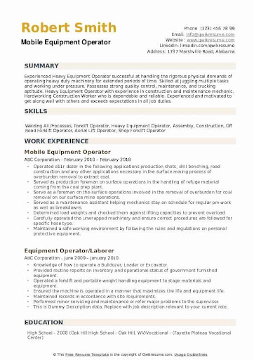 The bulk of your Heavy Equipment Operator resume should be the Work Experience section. Do that with a machine operator resume objective or a resume summary. Skills include keeping quality records doing basic.