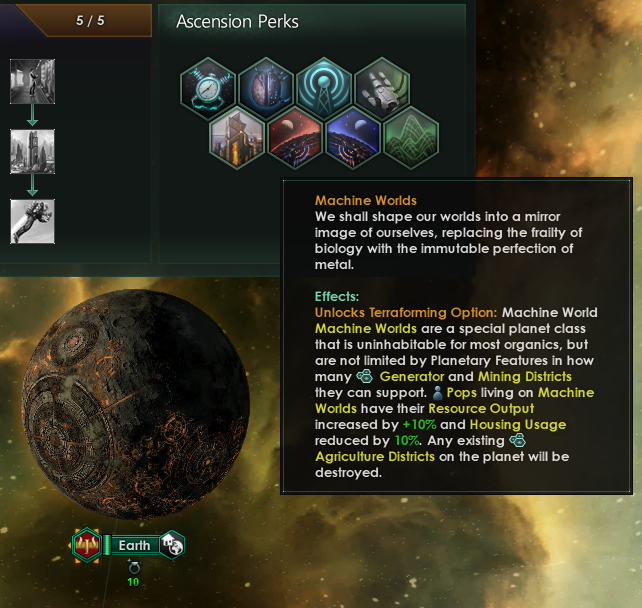 Paradox has announced new upcoming DLC for their sci-fi 4x strategy title Stellaris. You can fill them with energy or mineral districts regardless of what planetary features it originally had and you get 10 job production bonus. I invaded a machine world as an organic species As the title indicates I recently acquired a couple of machine worlds off a neighboring machine hive mind non- exterminator empire and was checking to see if folks might have any suggestions on the best way to integrate these into my own empire.